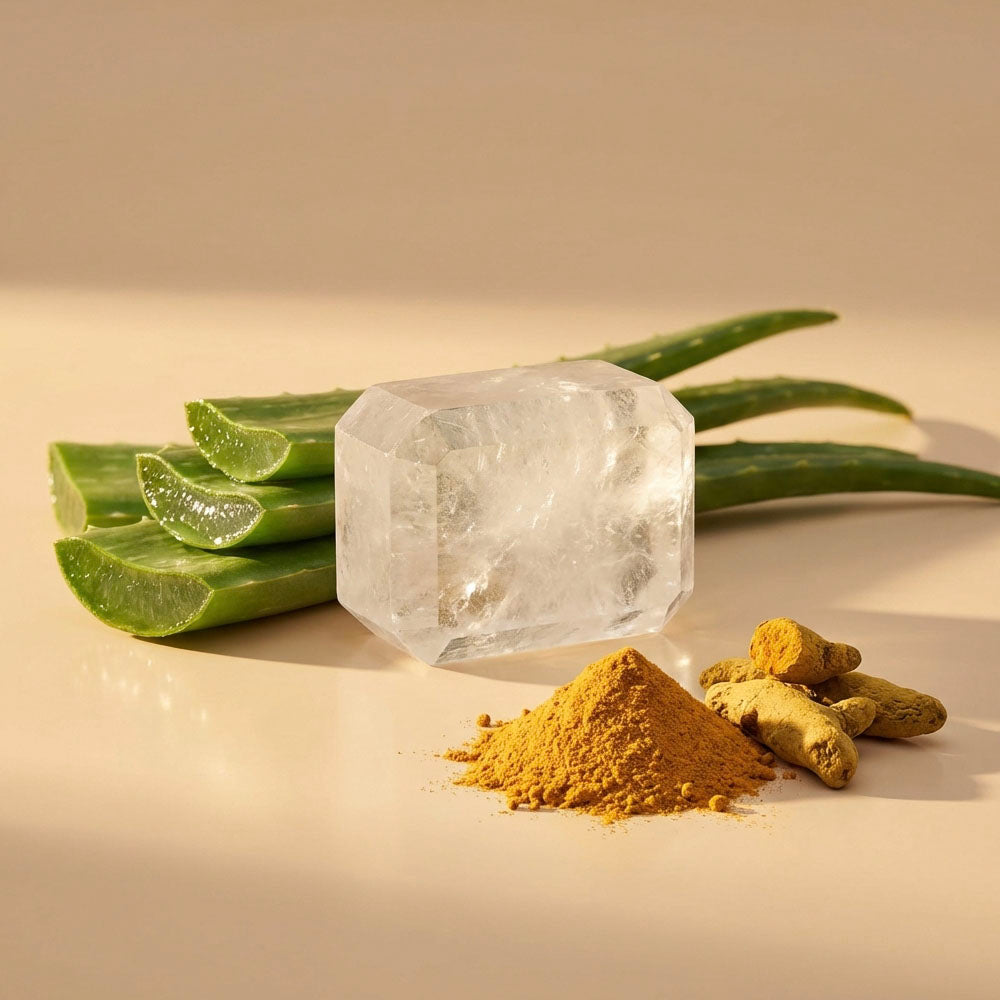 Instead, we use alum, aloe vera, and turmeric—a powerful blend that naturally combats odor and soothes the skin.